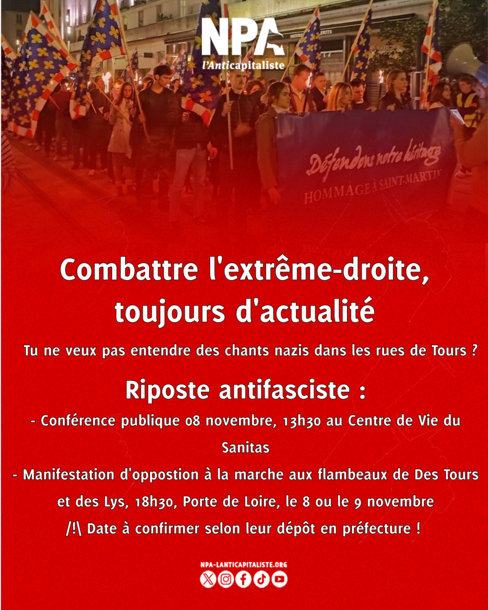 Pour contrer cette nouvelle édition de la marche, qui aura certainement lieu le 8 ou le 9 novembre 2025 (date encore à confirmer, car dépôt de leur marche tardif et secret), des organisations politiques, syndicales et associatives se sont associées pour organiser conférences et manifestations afin de ne pas laisser la place à l’extrême droite. Le Réseau antifasciste de Tours, dont est membre le NPA, organise donc la riposte. Parce que la lutte doit se faire unitaire, tout le milieu tourangeau — des associations d’aide aux migrant·es aux syndicats — est invité à venir assister le 8 novembre à des discussions sur comment faire front, au Centre de vie du Sanitas, l’un des quartiers de France hexagonale avec le plus haut taux de pauvreté.