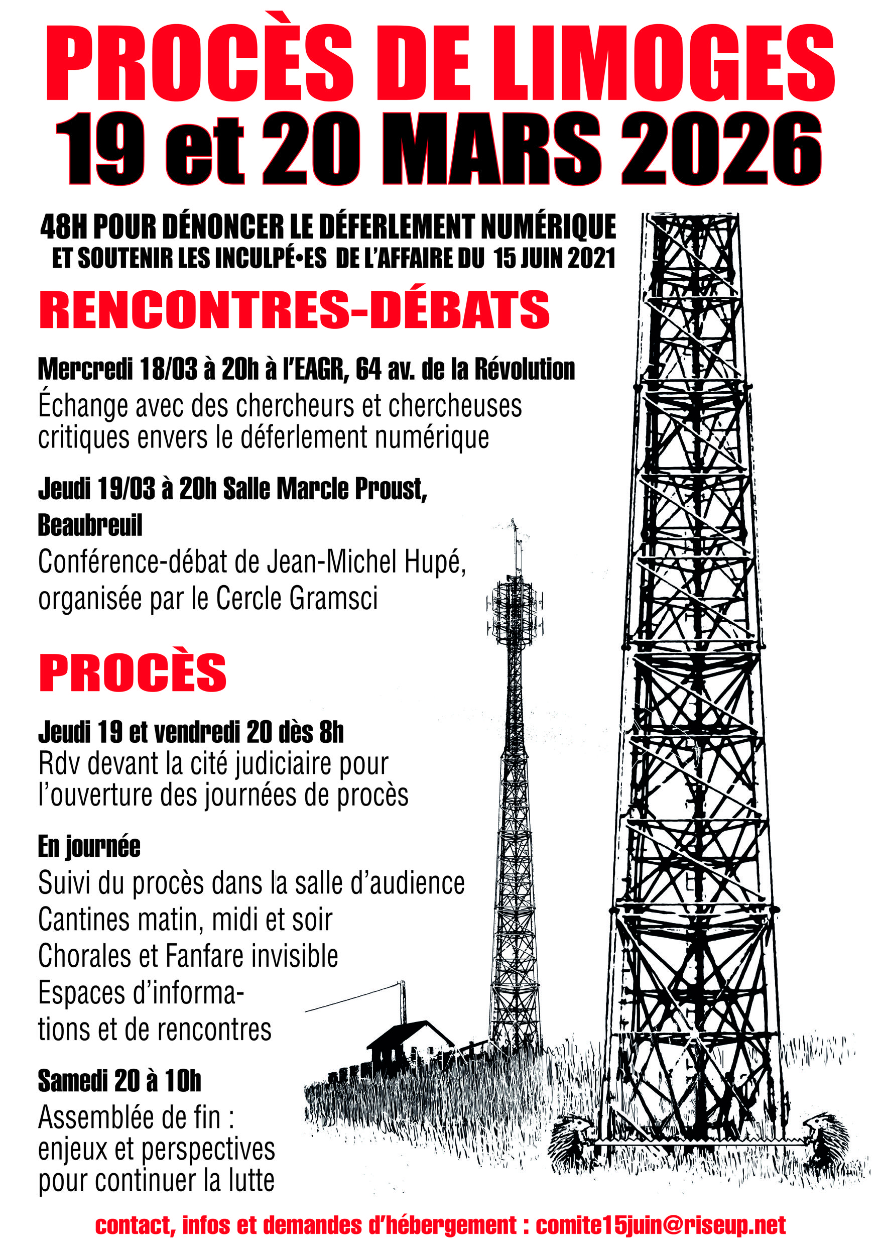 Les 19 et 20 mars 2026 à Limoges, à la suite d’une enquête menée avec les moyens de l’« antiterrorisme », deux personnes devront répondre des accusations d’« association de malfaiteurs » et de « dégradations de biens par moyens dangereux pour les personnes ». Les faits incriminés sont des sabotages par incendie (véhicules Enedis et antennes-relais), réalisés en opposition au déploiement du compteur Linky et de la 5G, en février 2020 et janvier 2021.
