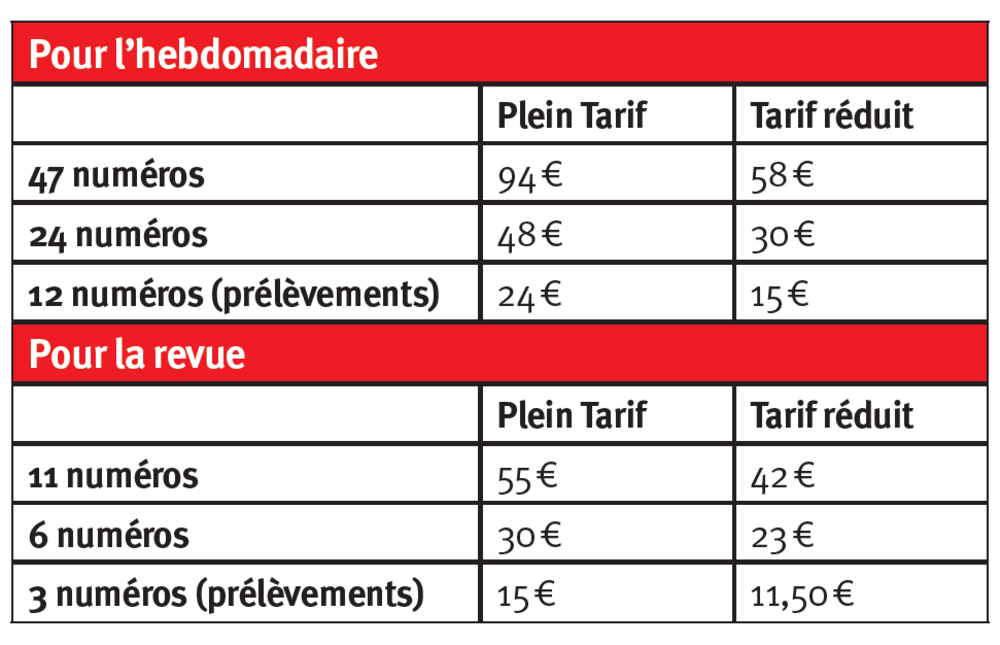 Pour remédier à ce problème, nous avons décidé d’augmenter de 50 centimes le prix de l’hebdomadaire et celui de la revue mensuelle, ce qui représente une hausse de 2,50 € par mois pour les abonnéEs aux deux titres. L’hebdomadaire passe donc à 2 € l’unité, et la revue à 5 €.