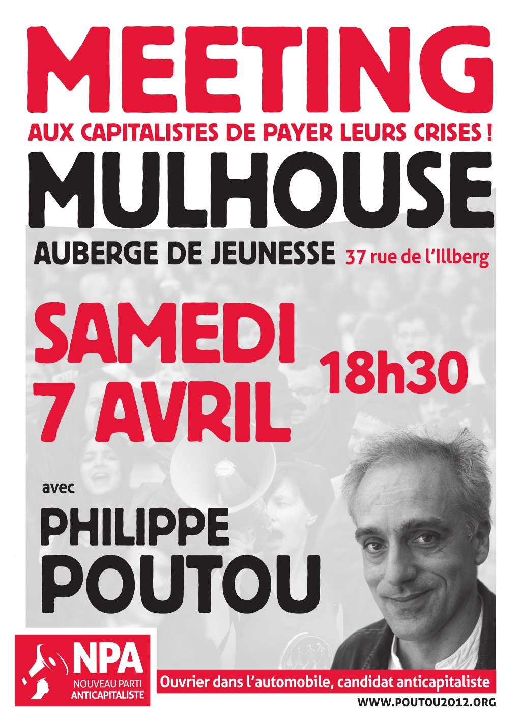 Le candidat NPA aux élections présidentielles : PHILIPPE POUTOU est de passage à Mulhouse pour un meeting. Militants, sympathisants , engagés ou simple curieux, venez nombreux à la rencontre de notre ouvrier de l'automobile. RDV SAMEDI 7AVRIL à 18H30 Auberge de Jeunesse Mulhouse37, rue de l'Illberg, 68200 Mulhouse, FranceEn vous remerciant par avance,pour le NPA MULHOUSErejoignez le NPA MULHOUSE sur sa page facebook : http://www.facebook.com/profile.php?id=100002080583625vous y retrouver également l’événement du meeting sur facebook: http://www.facebook.com/events/354733524579315/