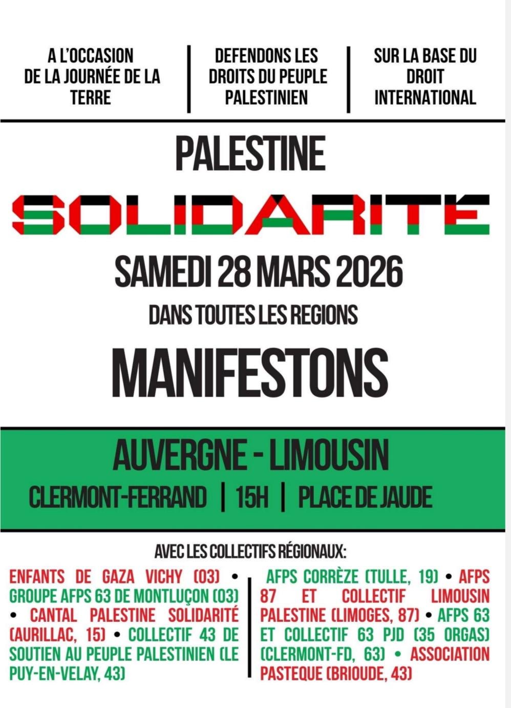 Manifestation Palestine solidarité Auvergne - Limousin, rendez-vous samedi 28 mars 2026, 15h place de Jaude.
