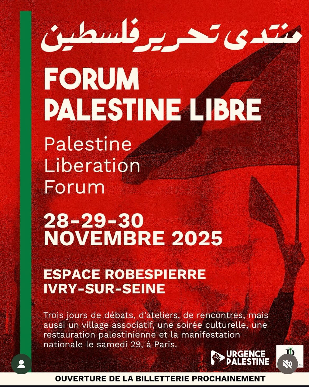 Forum « Palestine libre », organisé par Urgence Palestine, les 28, 29 et 30 novembre à Ivry-sur-Seine, espace Robespierre.