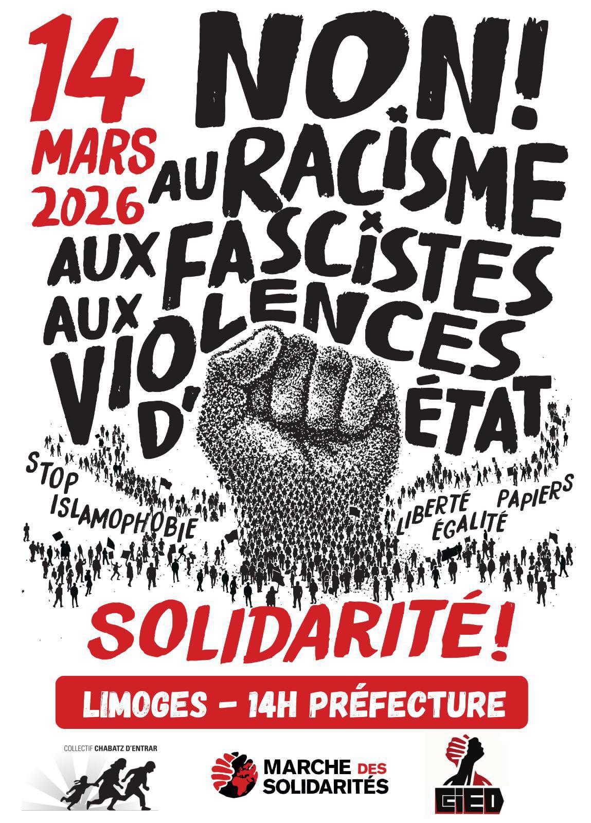 Samedi 14 mars 2026 - 14h00 « Non au racisme, aux fascistes, aux violences d'État ! » Rendez-vous à 14h devant la Préfecture à Limoges. Copied to clipboard