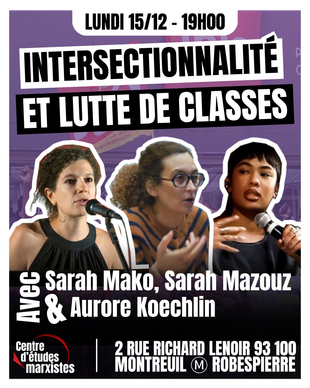 Le Centre d'études marxistes propose une soirée sur l'intersectionnalité et la lutte de classe, avec Sarah Mako, sari Mazouz et Aurore Koechlin.