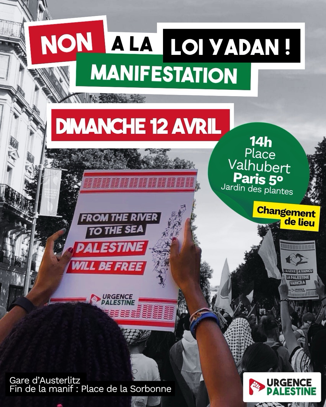 Dimanche 12 avril 2026 - 14h00 Manifestation contre la loi Yadan. Attention changement de lieu: rendez-vous dimanche 12 avril 2026 à 14h place Valhubert/Jardin des plantes. Copied to clipboard