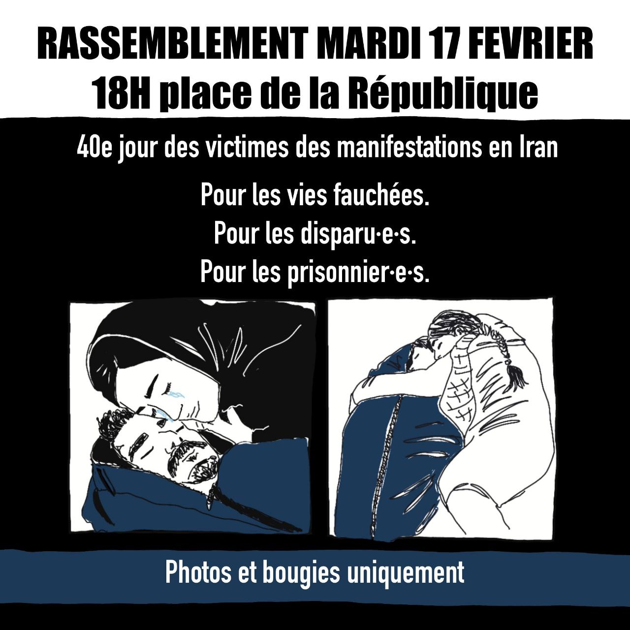 🚩 Pour le 40e jour des personnes tuées lors des récentes manifestations en Iran, nous nous rassemblerons place de la République, avec leurs photos et des bougies.