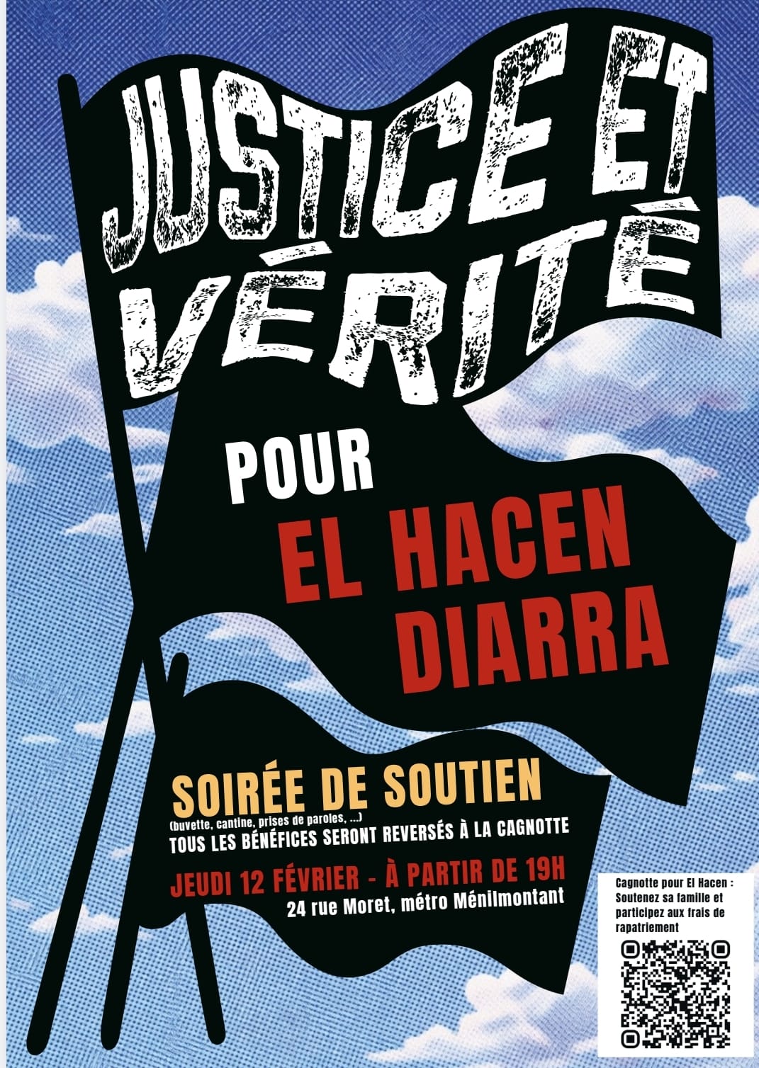 Soirée de soutien à la famille d’El Hacen Diarra à la Coopérative de Ménilmontant, jeudi 12 février 2026, à partir de 19h, 24 rue Moret, 75011 Paris. Métro Ménilmontant.
