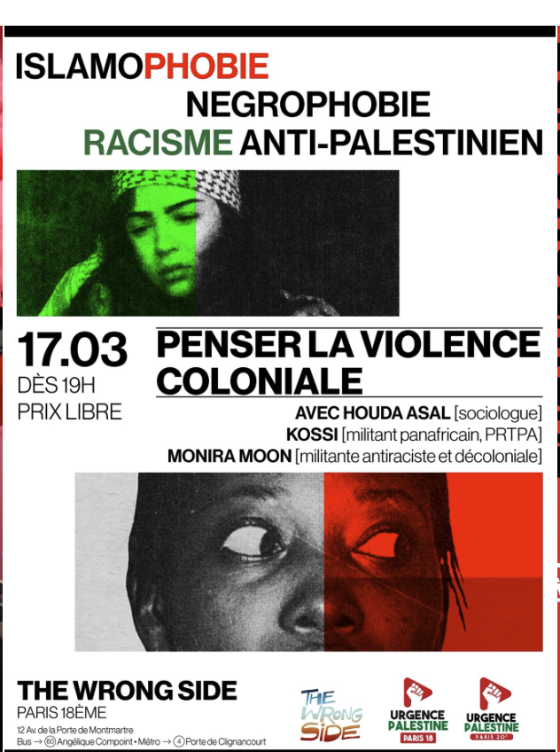 Soirée-débat «  Negrophobie, racisme anti-palestinien. Penser la violence coloniale » avec Houda Asal, Kossi, Monira Moon.
