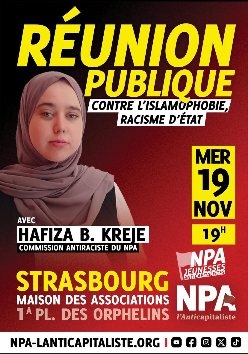 Réunion publique contre le racisme et l'islamophobie d'État, avec Hafiza B. Kreje, de la Commission antiraciste du NPA.