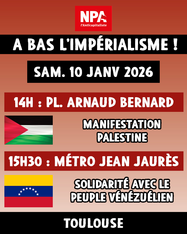 Samedi 10 janvier 2026 - 14h00 Rendez-vous 14h place Arnaud Bernard pour la manifestation en solidarité avec la Palestine et 15h30 métro Jean Jaurès en solidarité avec le peuple vénézuélien Copied to clipboard