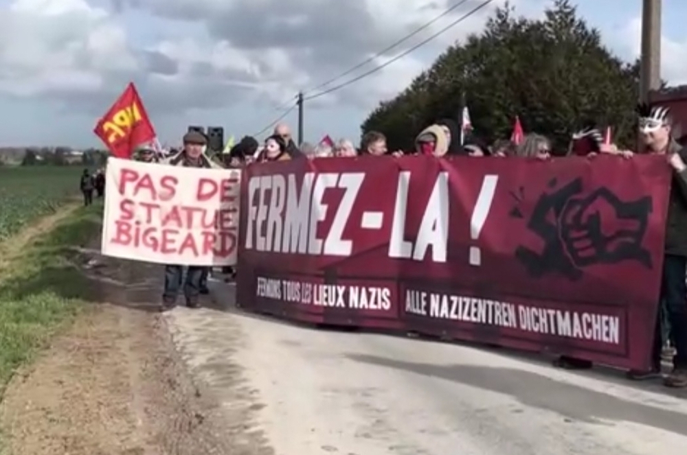 Le dispositif policier, quant à lui, a clairement illustré la tolérance de l’État pour ce groupe néonazi : des points de contrôle et de fouilles des voitures à chaque entrée du village, une centaine de gendarmes pour bloquer tout accès au hangar et empêcher toute atteinte aux biens contre celui-ci, une quinzaine de gendarmes pour sécuriser le cortège antifasciste, et un nuage de gaz lacrymogènes.