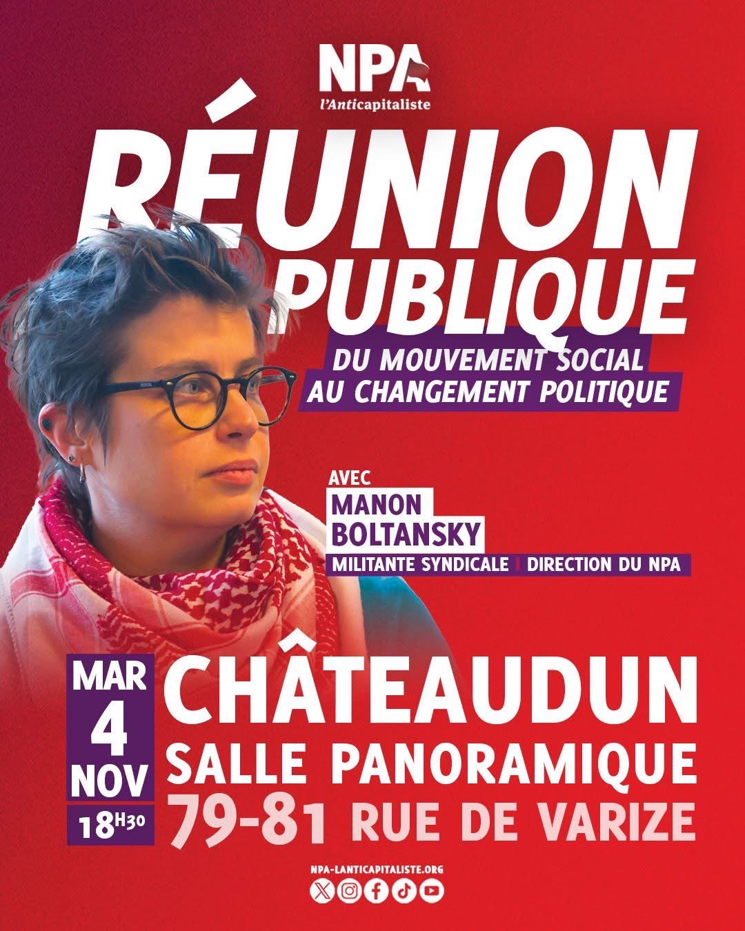 Réunion publique du comité NPA de Châteaudun : « Du mouvement social au changement politique », avec Manon Boltansky, militante syndicale et membre de la direction du NPA.