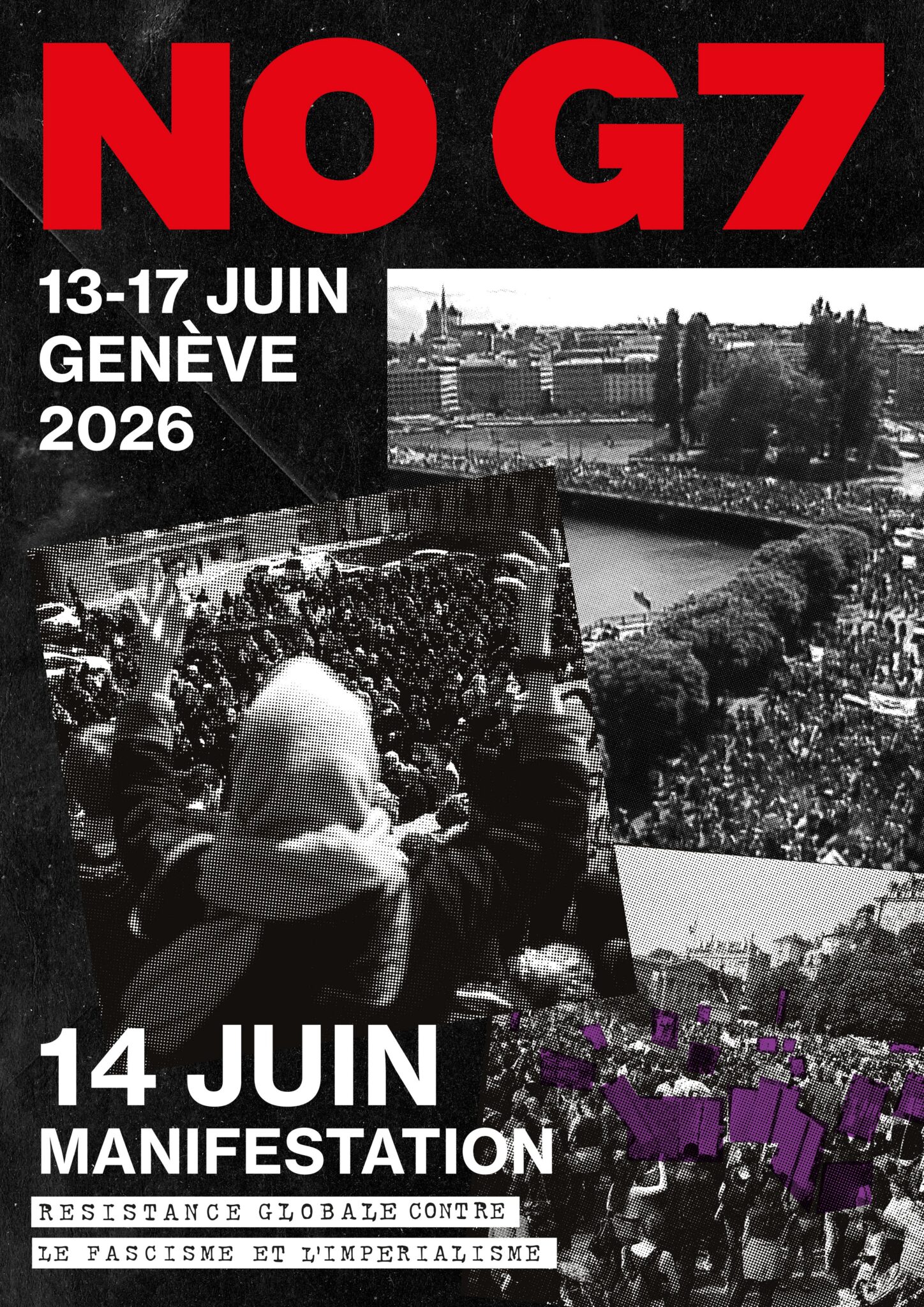 Mobilisation internationale contre le G7, du 13 au 17 juin 2026 à Genève, avec une manifestation « Résistance globale contre le fascisme et l'impérialisme » dimanche 14 juin.