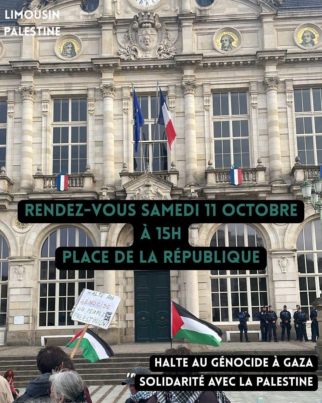 Samedi 11 octobre 2025 - 15h00 Rassemblement en solidarité avec la Palestine, à l'initiative de Limousin Palestine. Rendez-vous samedi 15 octobre 2025, à 15h place de la République à Limoges. Copied to clipboard