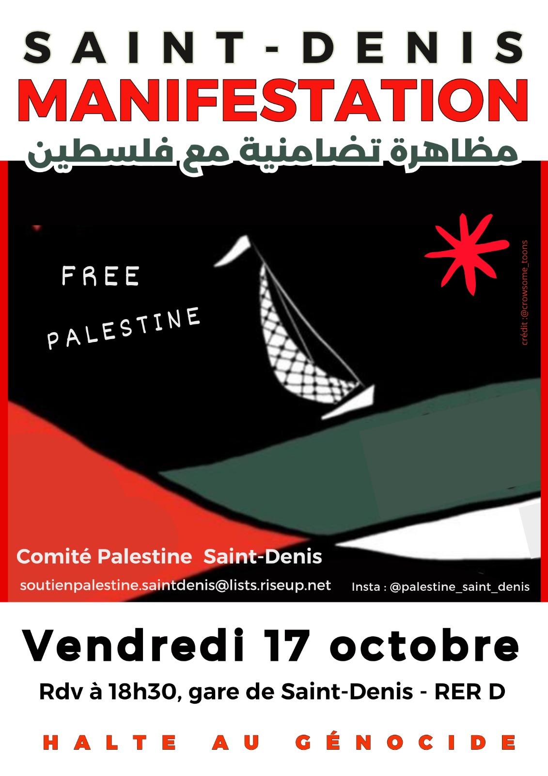 Vendredi 17 octobre 2025 - 18h30 Manifestation organisée par le Collectif Palestine Saint-Denis, rendez-vous vendredi 17 octobre 2025, 18h30, gare de Saint-Denis. Copied to clipboard